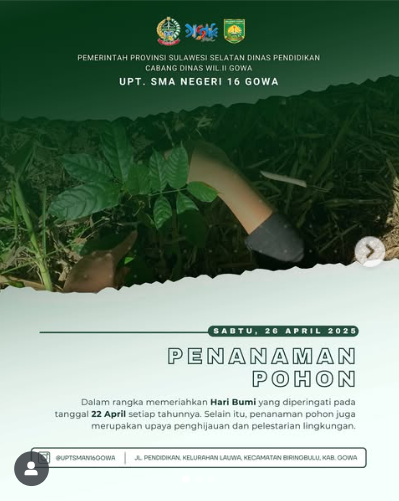 Dalam rangka memperingati Hari Bumi yang jatuh pada 22 April, UPT SMA Negeri 16 Gowa mengadakan kegiatan penanaman pohon sebagai bentuk kepedulian terhadap lingkungan. Kegiatan ini bertujuan untuk mendukung penghijauan lingkungan dan mengajarkan kepada siswa agar mencintai lingkungan tetap lestari.