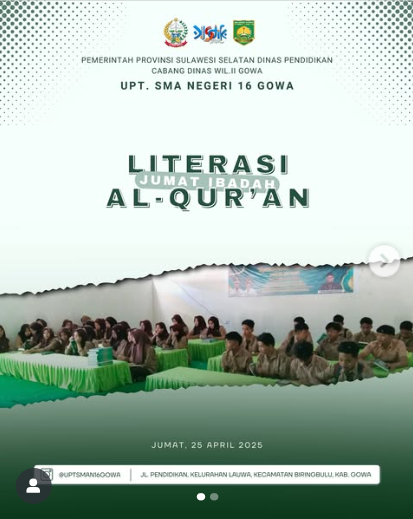 Melalui program Jumat Ibadah, siswa-siswi SMA Negeri 16 Gowa melaksanakan kegiatan literasi Al-Qur’an sebagai wujud pembinaan spiritual. Kegiatan ini dilaksanakan rutin untuk menumbuhkan kecintaan siswa dalam membaca dan mentadabburi Al-Qur'an.
