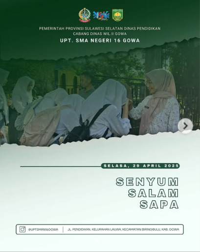 Dalam membentuk budaya positif di lingkungan sekolah, SMA Negeri 16 Gowa menerapkan program Senyum, Salam, Sapa. Program ini bertujuan menumbuhkan sikap ramah, saling menghargai, dan menciptakan suasana yang nyaman bagi siswa.